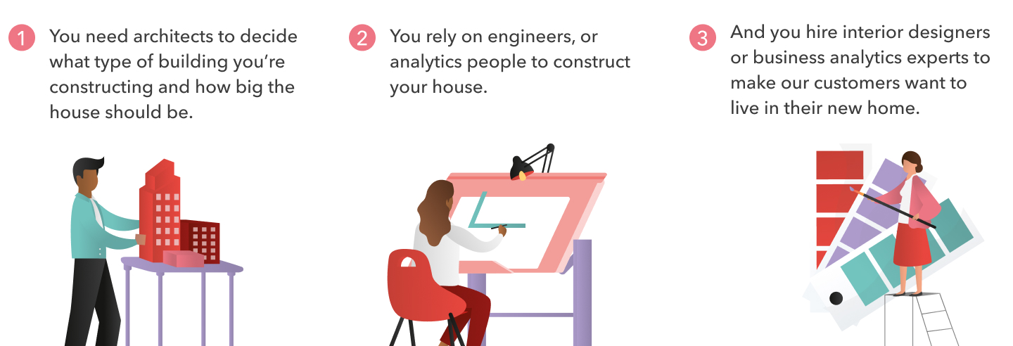 • Engineers and masons construct the building. Our analytics colleagues are the people who configure all the tools and ensure that they work together.
