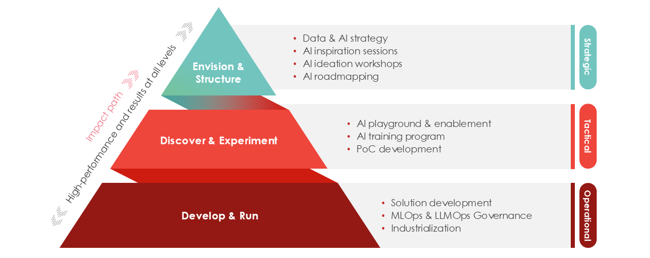 With AI evolving at lightning speed, keeping up with every new development can feel like an impossible task. We can help kickstart your journey through our systematic approach based on one important principle: dare to experiment, and never be afraid to fail.