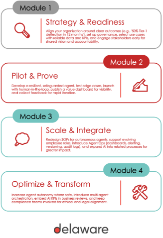 Focusing on Agentic AI deployment, at delaware, we approach this with a modular, flexible roadmap, allowing you to begin where the value is most evident and activate only the modules that suit your immediate needs. It is composed by four modules: