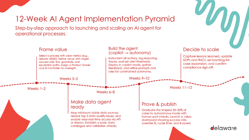 Redesign standard operating procedures to accommodate autonomous agents, support evolving employee roles, and introduce AgentOps. Begin expanding AI capabilities into related processes to maximize impact, while maintaining transparency.