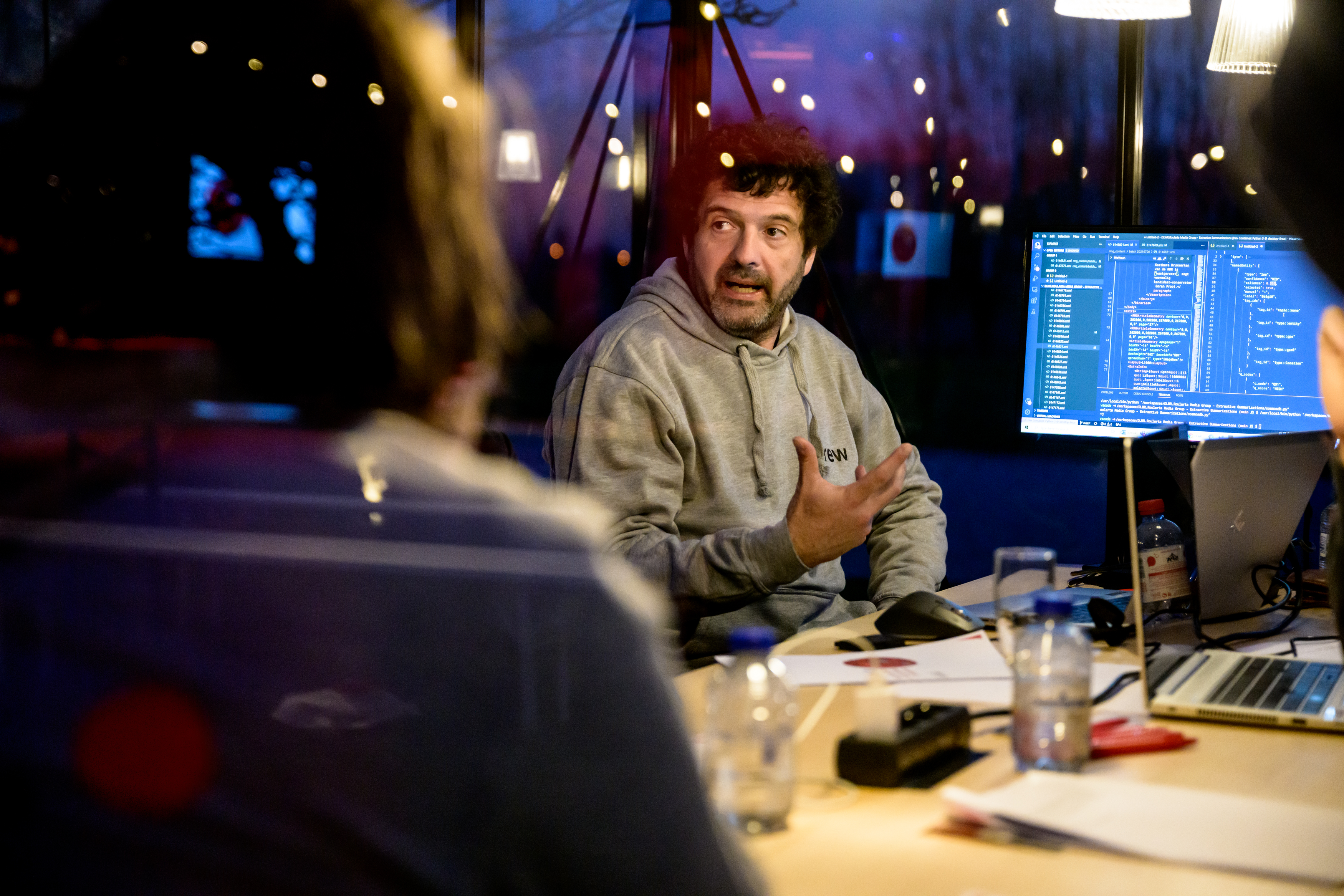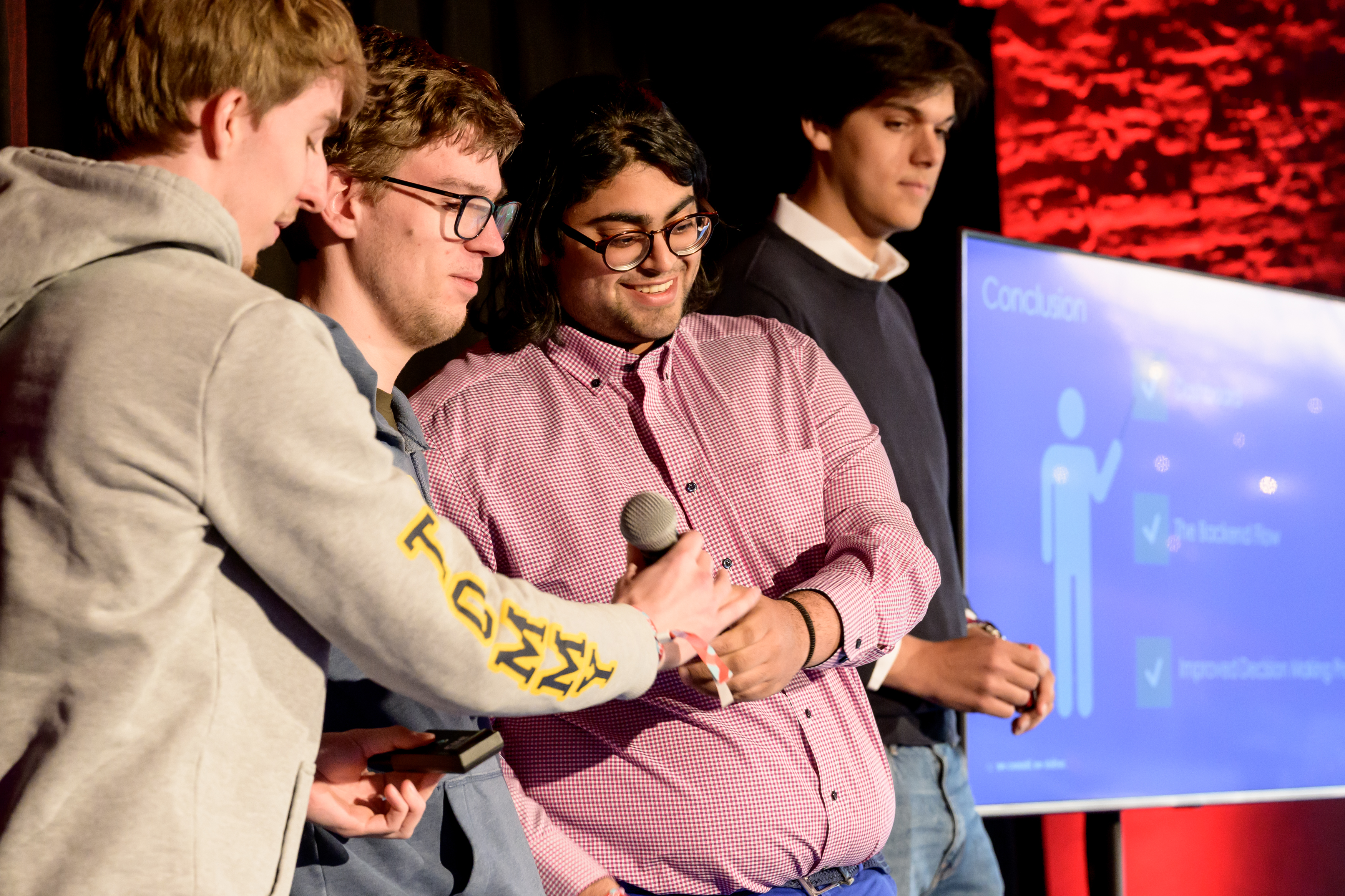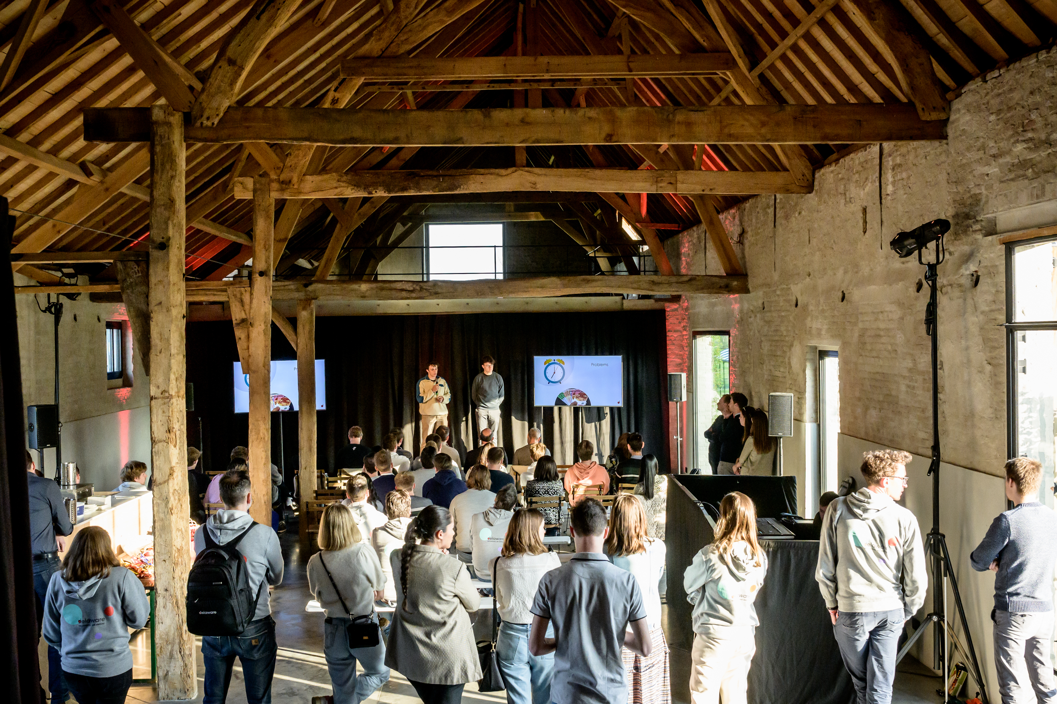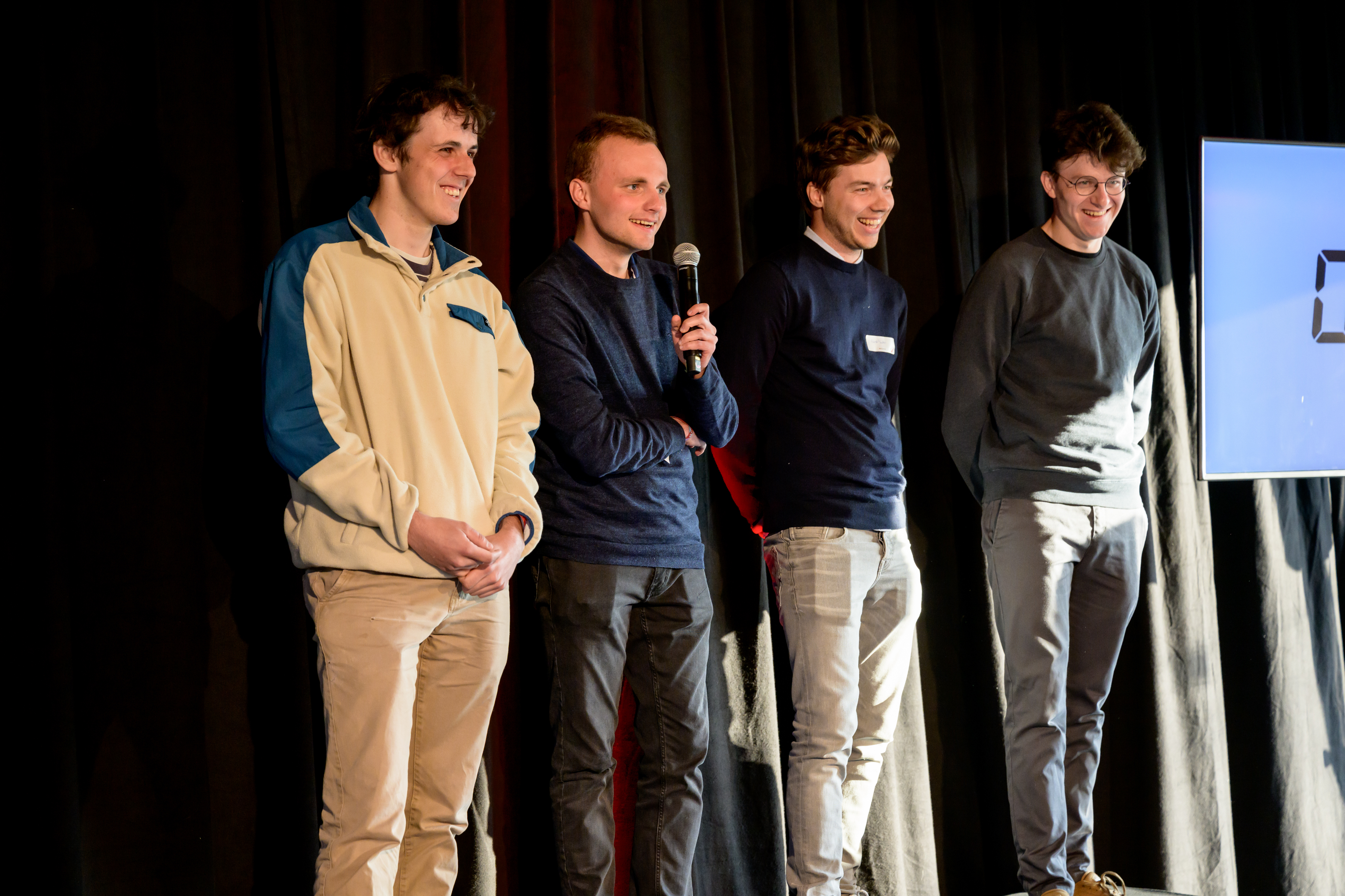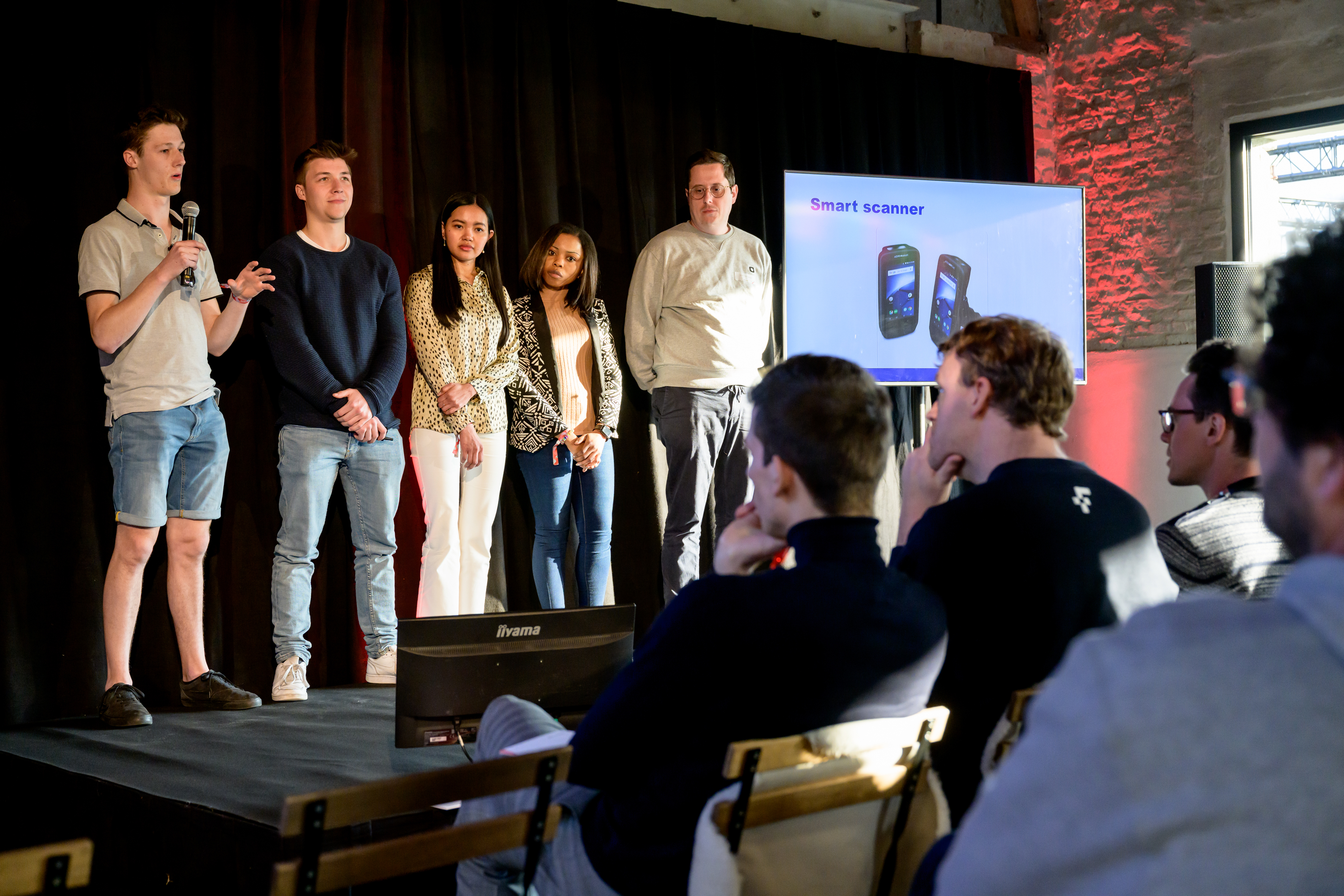 À 17h pile, Caro a rassemblé les étudiants, les coaches et les membres distingués du jury dans l'arène de présentation. Au cours d'un pitch de 15 minutes, chaque équipe a eu l'occasion de présenter son cas et sa solution au jury composé d'experts de delaware, les professeurs Serge Demeyer (Université d'Anvers) et Erik Mannens (Université de Gand) ainsi que Stijn Wijndaele (partenaire fondateur de Scalefactory) et Simon Temmerman (CTO de dScribe). Après chaque présentation, le jury a posé un certain nombre de questions, allant des aspects techniques aux aspects plus fonctionnels.