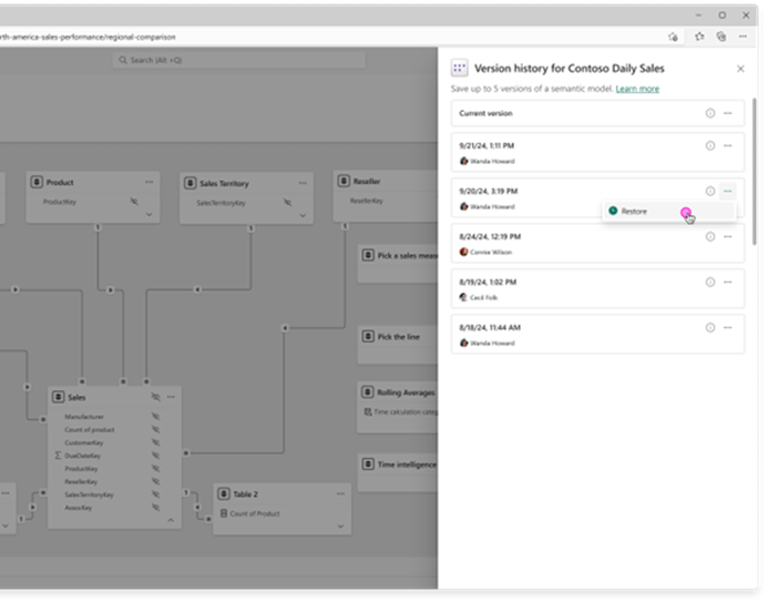 La collaboration sur des modèles sémantiques compliquait auparavant le suivi des modifications en cours. Si les pipelines de déploiement affichaient les différences avant le passage en test ou en production, il n'était pas simple de suivre les modifications en temps réel. Microsoft Power BI Online a désormais changé la donne : vous pouvez voir qui a effectué quelles modifications et même restaurer les versions précédentes si nécessaire.