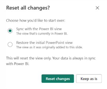 Lors de l’intégration de rapports Microsoft Power BI dans Microsoft PowerPoint, vous pouvez désormais choisir de conserver la mise en page d’origine ou de synchroniser avec la dernière version en ligne.