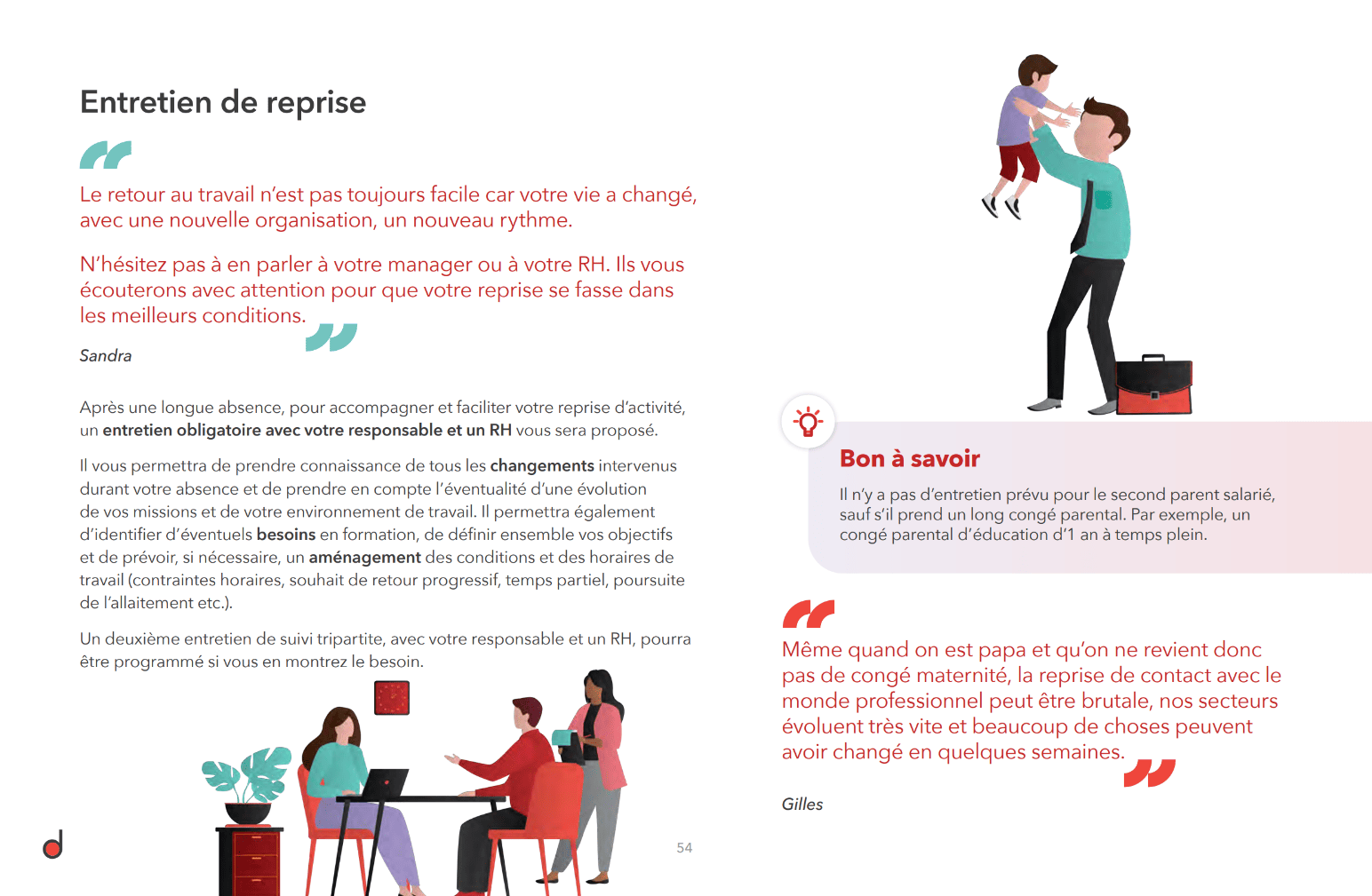 Il aborde chaque étape du parcours parental : avant l’arrivée de l’enfant, pendant le congé, et au retour en entreprise.